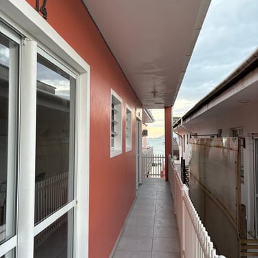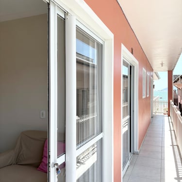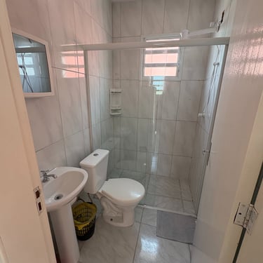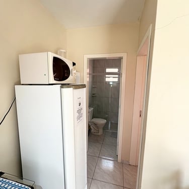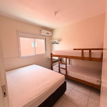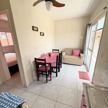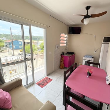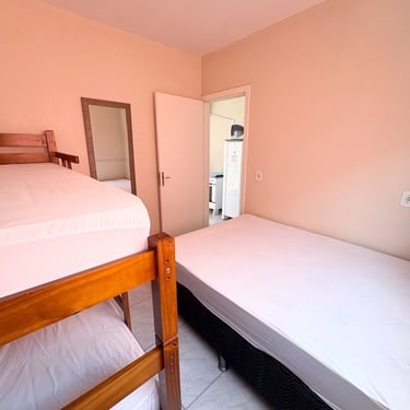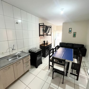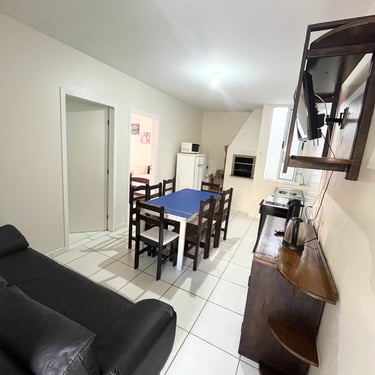 Apartamento localizado no primeiro andar/fundos, com cozinha/sala com 1 TV, sofá, pia, mesa, geladeira, microondas, e fogão; 1 quarto com ar-condicionado, 1 cama de casal, e 1 beliche. Tanque de lavar roupas e churrasqueira comunitários. Internet Wi-Fi.