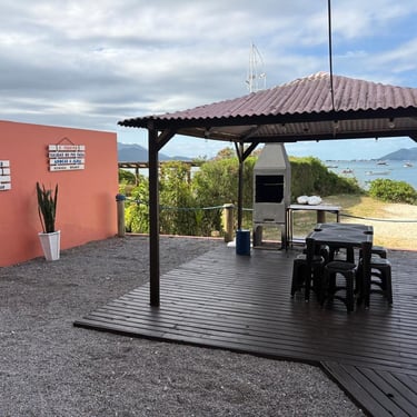Para melhor atender nossos hóspedes, dispomos de áreas de uso comum como um amplo terraço com vista panorâmica da Praia de Baixo-Pinheira, espaço com churrasqueira e a frente do residencial com mesas, cadeiras, uma tenda, rede e dois caiaques que são disponibilizados sem custos aos nossos hóspedes.